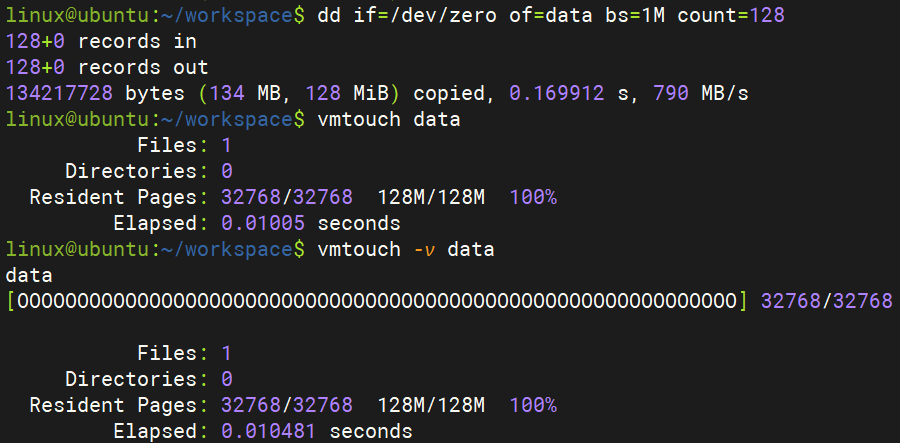 我们先来看一个例子,来直观的认识一下 Direct I/O。我们使用 dd 命令来生成一个 128M 的全零的文件,在不加任何 flag 的情况下,dd 使用的是 Buffered I/O ,所以数据是要经过 Page Cache 的,而且在 dd 完成之后,文件数据仍然会在 Page Cache 中驻留一段时间。这一点我们可以通过命令 vmtouch 来验证。执行 vmtouch -v 命令,该命令会显示出来指定文件在 Page Cache 中的驻留情况,我们刚使用 dd 走 Buffered I/O 生成的文件内容全部都被缓存在 Page Cache 中。