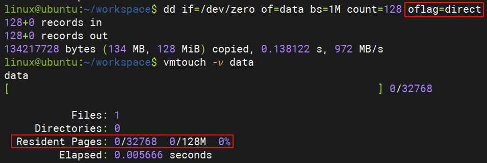 下面我们还是使用刚才的 dd 命令,再加上 oflag=direct 参数,该参数表示 dd 输出文件时使用 Direct I/O。这次在文件生成之后,立刻使用 vmtouch 去查看该文件时,发现该文件完全没有在 Page Cache 中驻留,这和 Direct I/O 的行为是一致的。