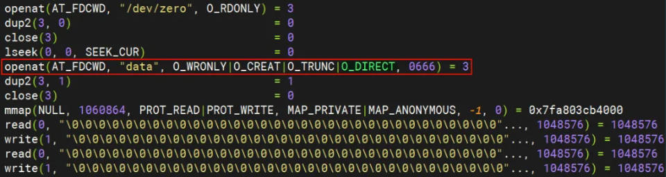 可以发现两种情况的区别在于使用 Direct I/O 时,打开文件的系统调用 openat 多了个 O_DIRECT flag。