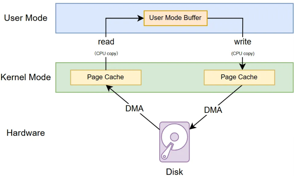Buffered I/O 的读写示意图如下,程序需要调用 read 系统调用把(输入文件的)内核态的 Page Cache 中的数据通过 CPU 拷贝至用户态缓冲区中,然后调用 write 系统调用把用户态缓冲区中的数据通过 CPU 拷贝至内核态(输出文件的) Page Cache 中。