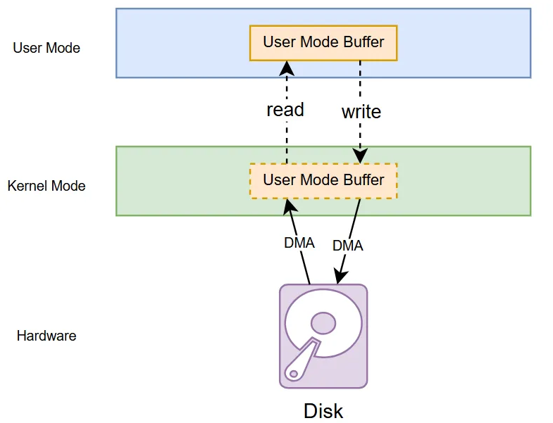 Direct I/O 的读写示意图如下,这里的 read 和 write 系统调用仅仅是起一个控制作用,不会有真正的(CPU)数据拷贝,用户态的缓冲区被 pin 在了内核态,DMA 直接使用用户态的缓冲区进行数据搬运。