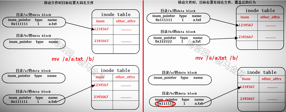 (3).挂载后,挂载点的元数据和data block是分别存放在不同文件系统上的。