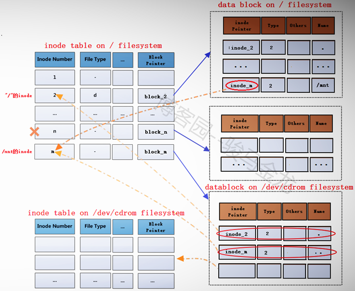 block_m指向的是文件系统/dev/cdrom的data block,所以严格说起来,除了/mnt的元数据信息即inode记录m还在根文件系统上,/mnt的data block已经是在/dev/cdrom中的了。这就是挂载新文件系统后实现的跨文件系统,它将挂载点的元数据信息和数据信息分别存储在不同的文件系统上。
